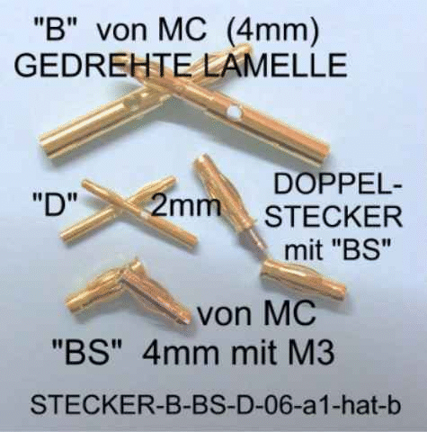 Abb. stecker-B-BS-D-06-a1-hat-b.gif zeigt alle Orginal MC Lamellenstecker unseres Programmes “B” “Profi” 4mm Goldi von MC, ein 4mm Stecker, mit der hochwertigen, gedrehten Lamelle, zum Teilen in Stecker und Buchse. “D” “Profi” 2mm Goldi mitte links: 2mm Goldstecker von MC Typ “D”, zum Teilen.